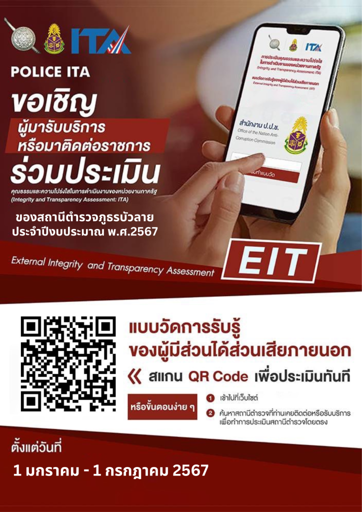 ขอเชิญชวน ผู้มารับบริการ / มาติดต่อ สถานีตำรวจ ร่วมประเมินแบบวัดการรับรู้ของผู้มีส่วนได้ส่วนเสียภายนอก (External Integrity and Transparency Assessment: EIT)สำหรับนำไปพัฒนาปรับปรุงการให้บริการของสถานีตำรวจ ประจำปีงบประมาณ 2567